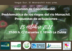 Convocamos: Vega Sur. El Monachil nos une. Ecologistas en Acción. Somos Vega. Somos Tierra. Comunidades de regantes de Jacín, Acequia Gorda de la Zubia y Genital.